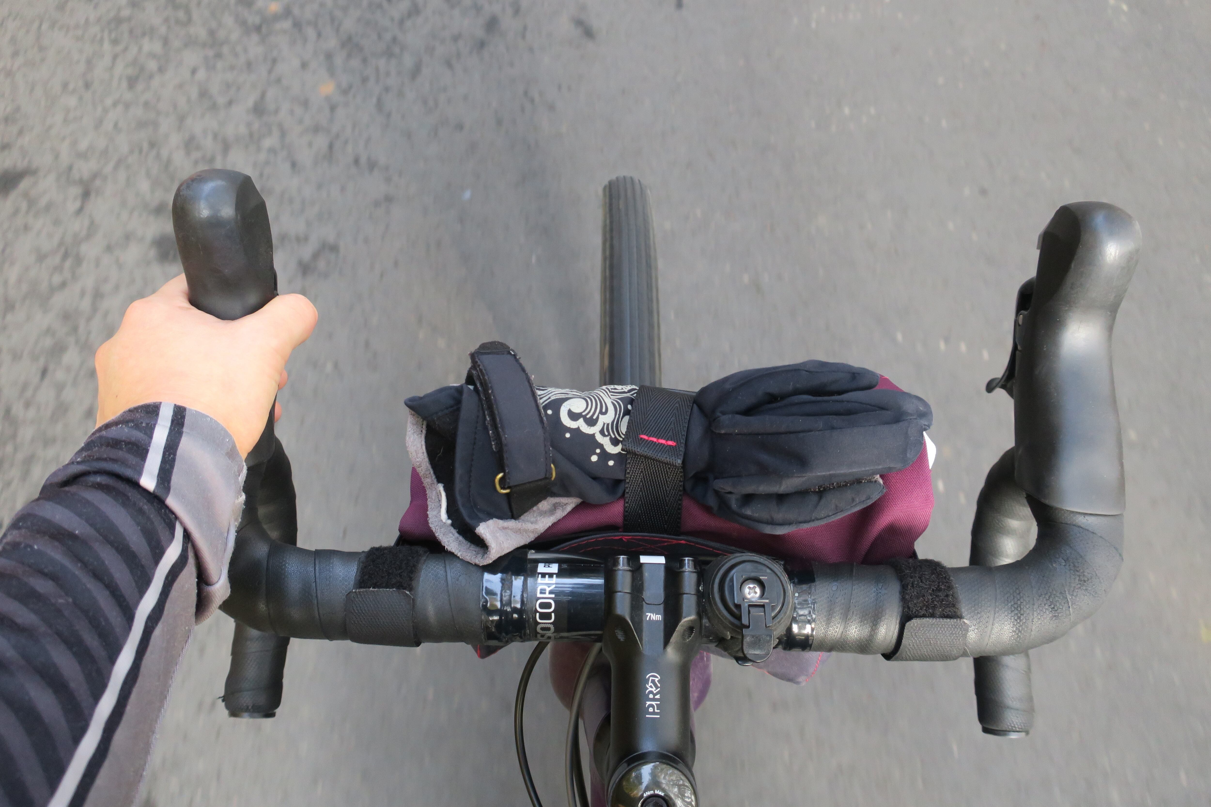 コゼバッグ的には、予備チューブと簡易工具はサドルの下につける小型のサドルバッグよりもハンドルにつけてる方が安心です。何台も乗り換える場合は特に脱着の簡単さが魅力的。バイクジャージの背面ポケットに入れて汗や巻き上げる地面の水で汚れる心配をするよりも、ポイポイとハンドルバッグに入れておく方が、案外安心だな、と思うのです。