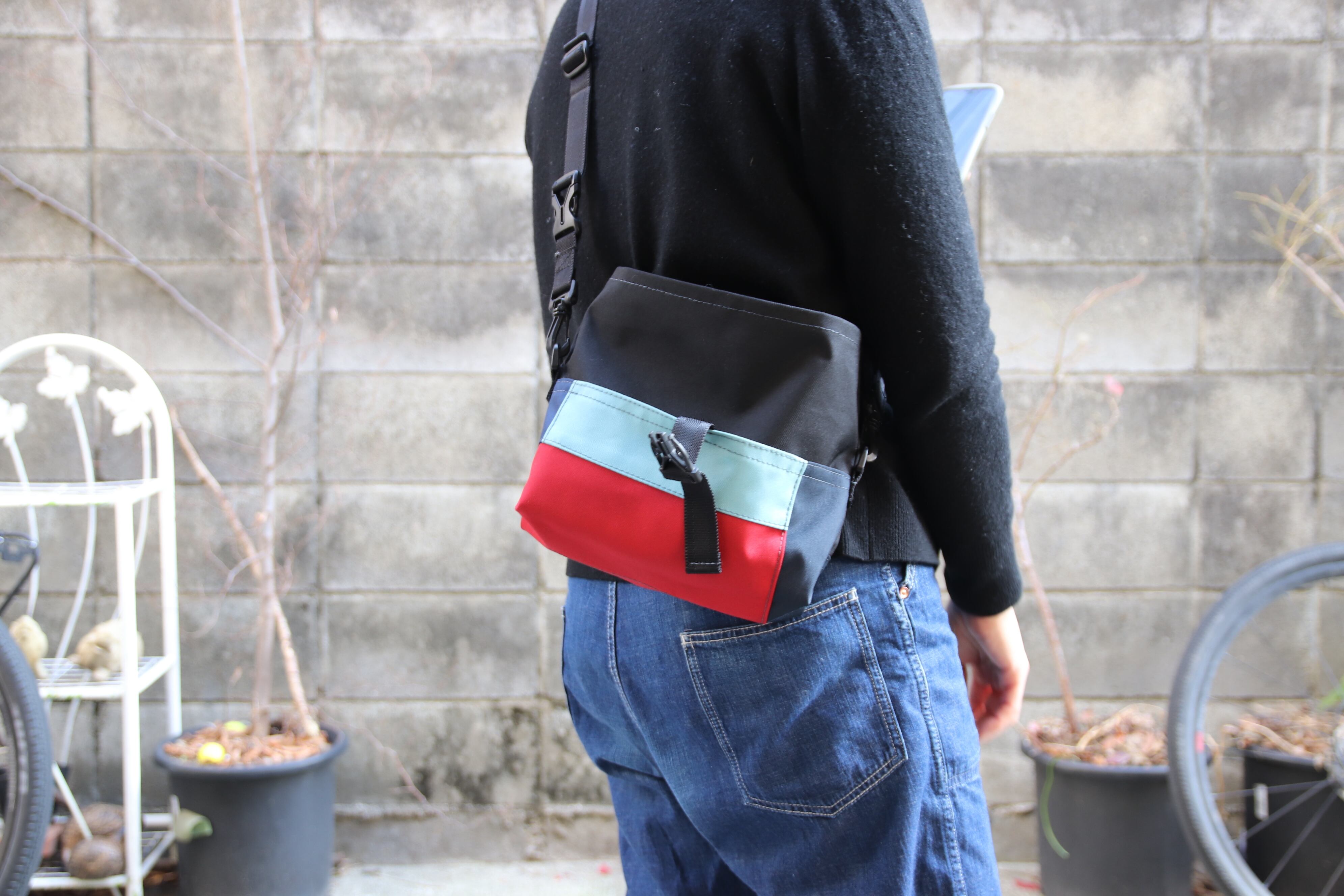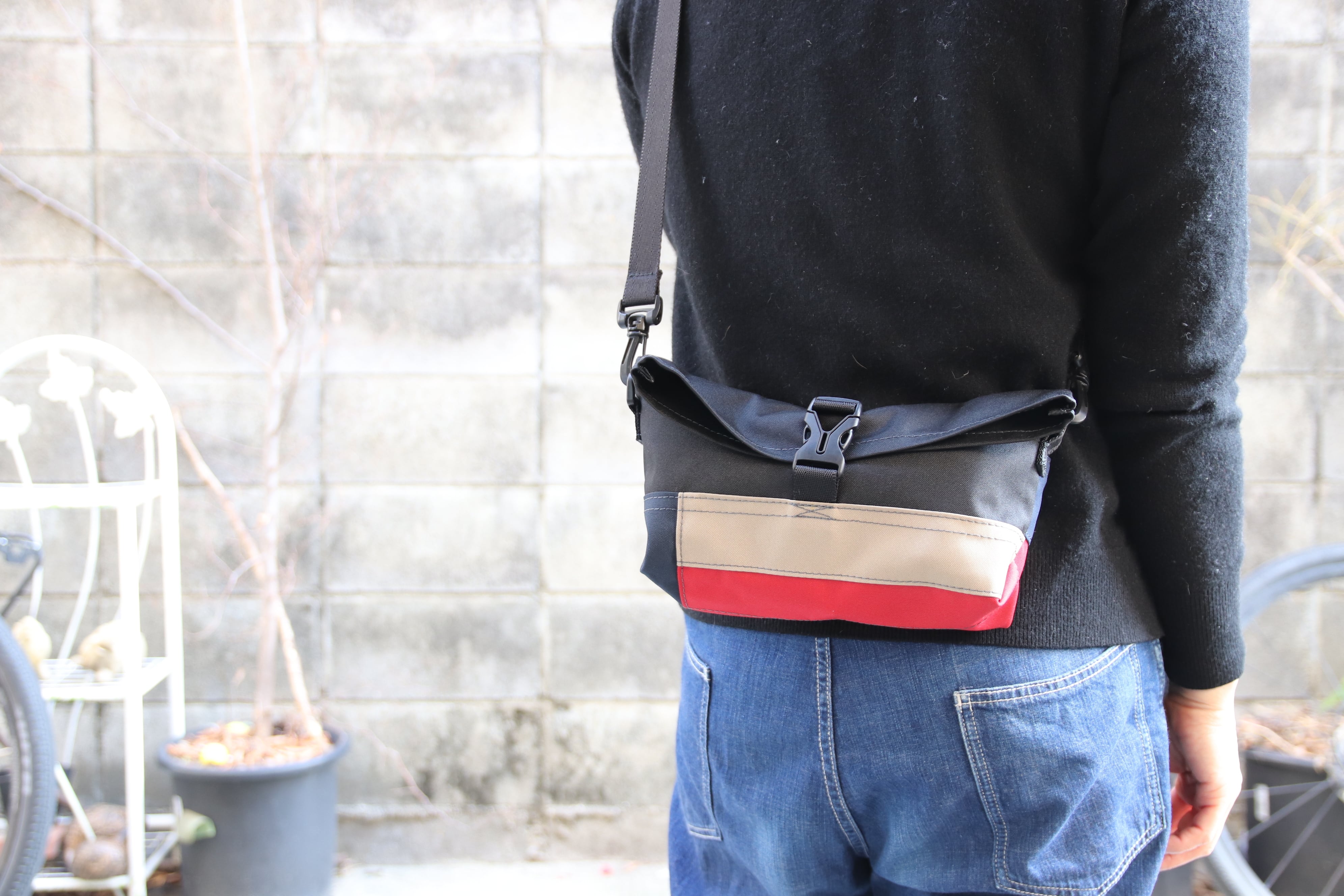 アジャスター付きの全長125cmのショルダーベルトがついていますが、ライドの時はウェストポーチとして使えるようプラスティックバックルのカチッとがベルトについてますのでトイレで焦る心配はありません。