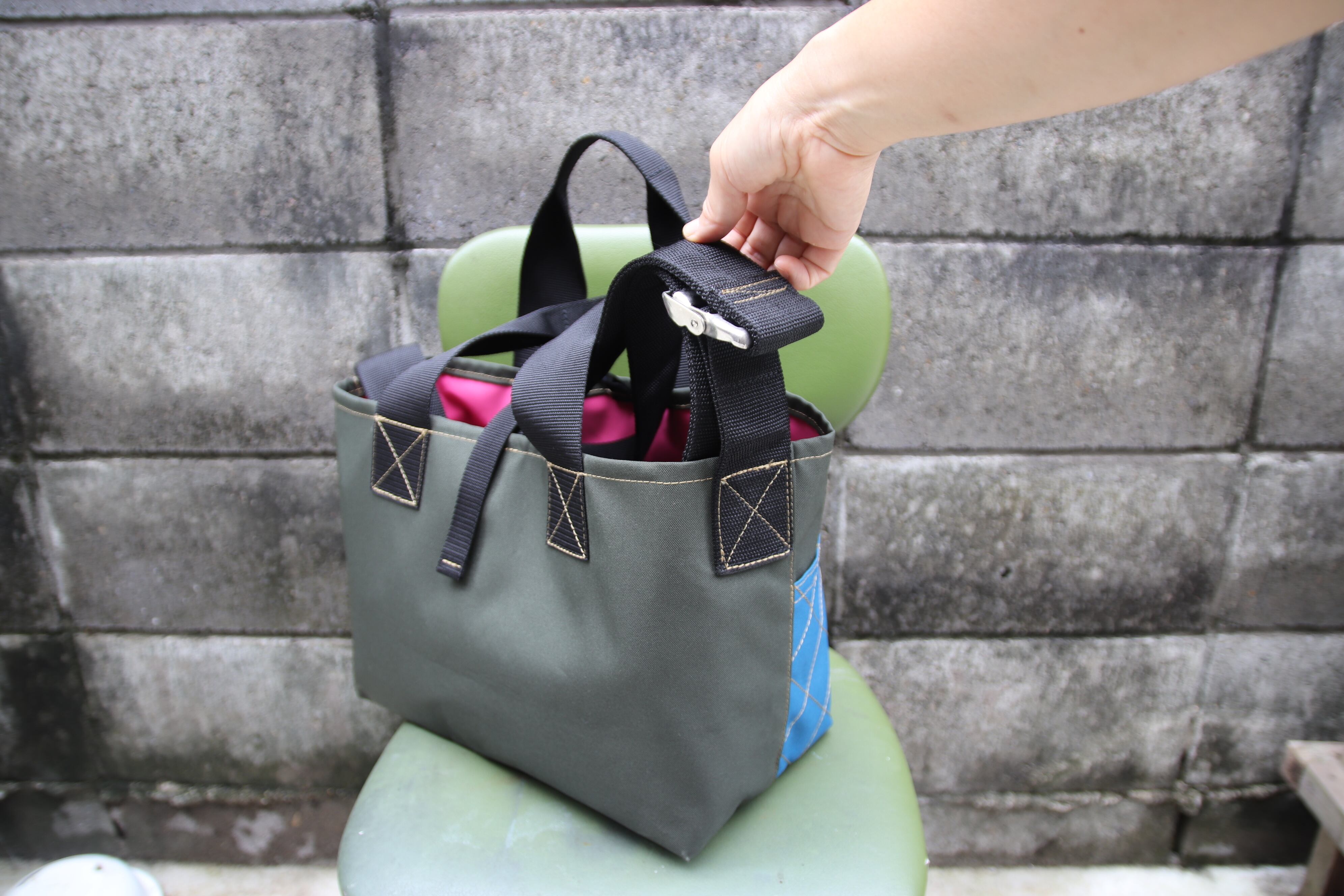 トート型メッセンジャーSサイズ オリーブグリーン ×青格子ステッチ 右掛け用